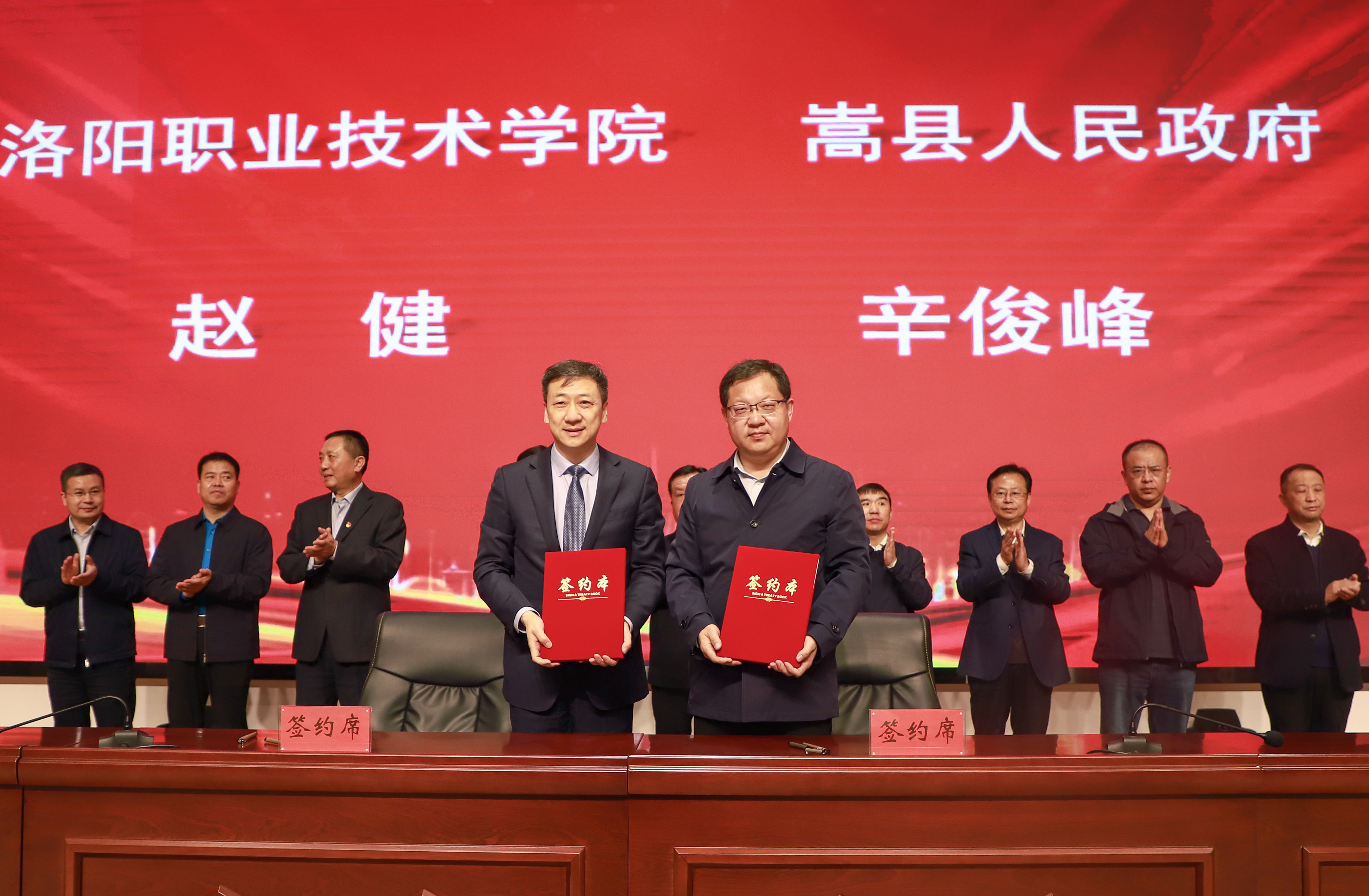 签约大会上,院长赵健代表我校分别与涧西区区委副书记、区长王烨,洛龙区常务副区长胡贵生,伊滨区党工委副书记、管委会主任樊灿涛,嵩县县委副书记、代县长辛俊峰签订校地合作产教融合协议。