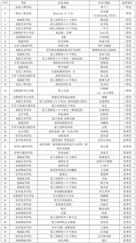 自《关于举办“爱上洛职的1+N个理由”短视频拍摄大赛的通知》发布以来,学生中心将各二级院系上报的参赛作品进行汇总后,8月30日,评委老师结合作品内容以及点赞量进行综合评审,共选出52件获奖作品,2个优秀组织奖,29名优秀指导教师。现将获奖名单公示如下,公示期2023年9月1日至9月3日,电话:0379-63189387。