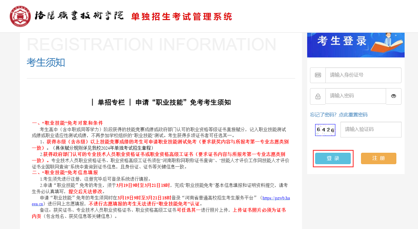 (1)申请我校“职业技能”免考的学生,须首先于2024年3月19日9时至3月21日18时登录“河南省普通高校招生考生服务平台”(https://pzwb.haeea.cn)进行网上志愿填报。我校河南专科招生代码:6384。
