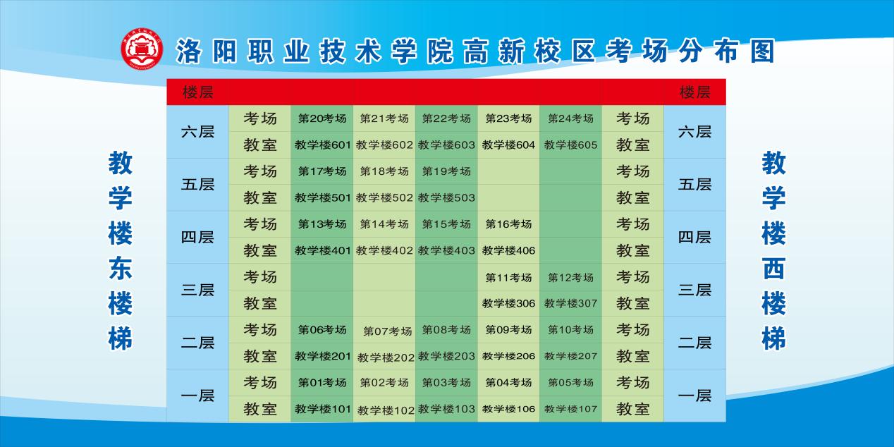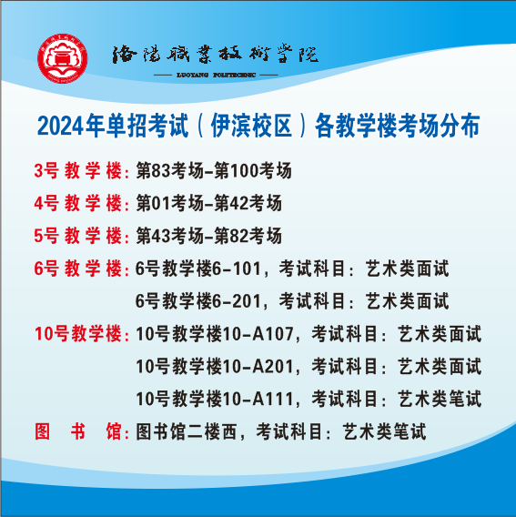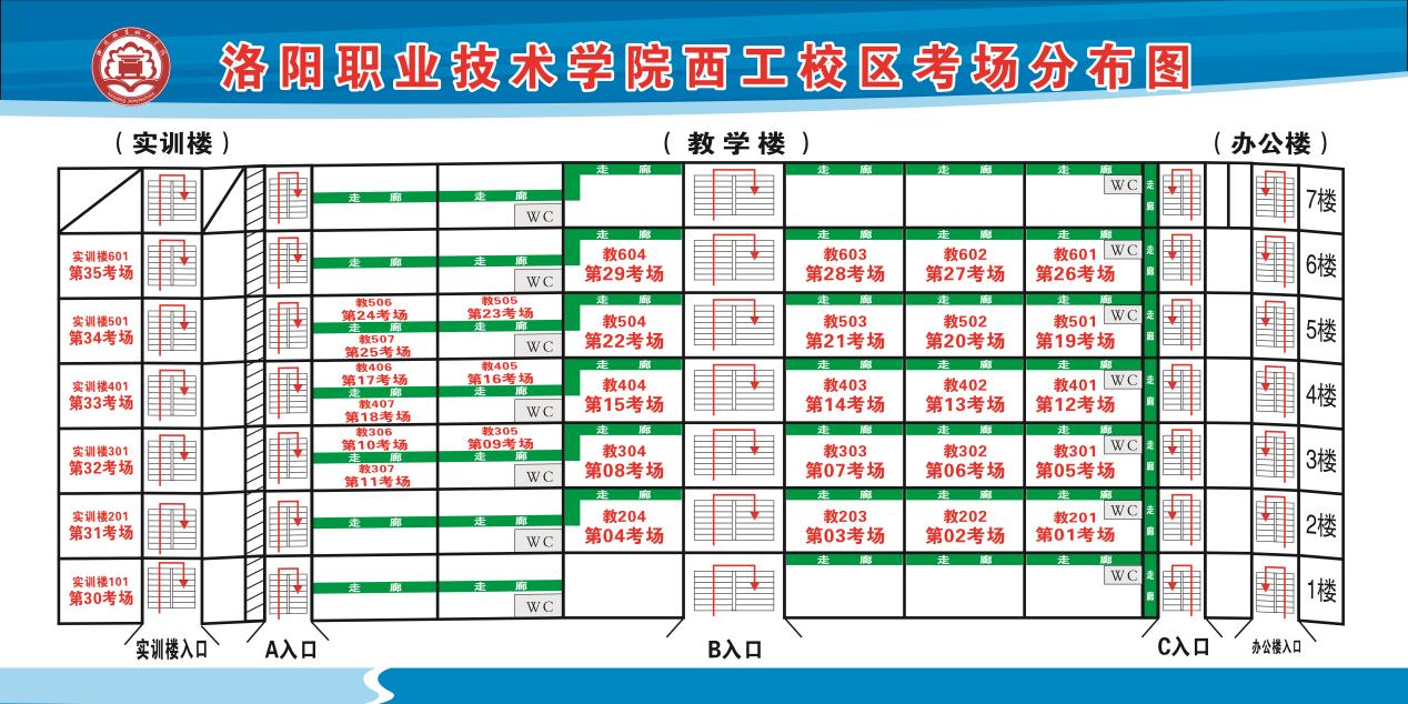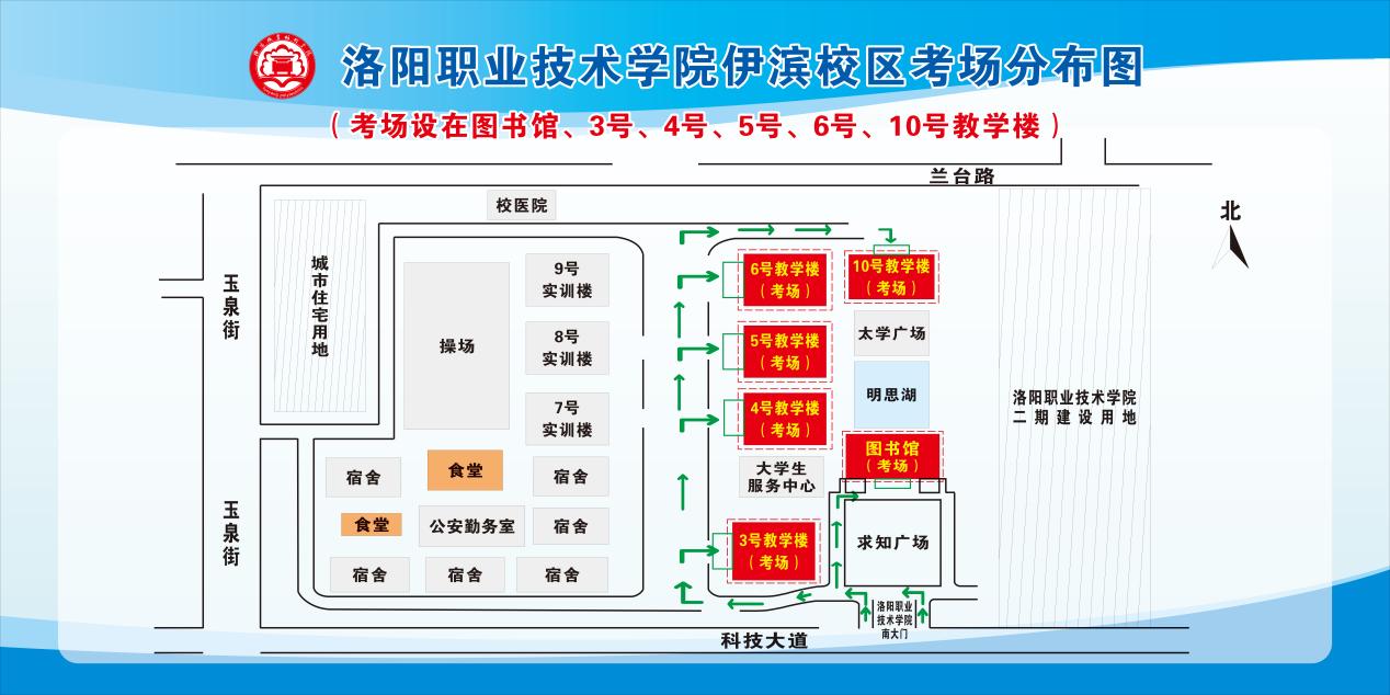 温馨提醒:今年我校单招考点安排分为伊滨、西工和高新3个校区,请考生务必认真查看本人所在考点具体地址,合理安排赴考行程。请考生自行查看下图我校考点、考场分布图。
