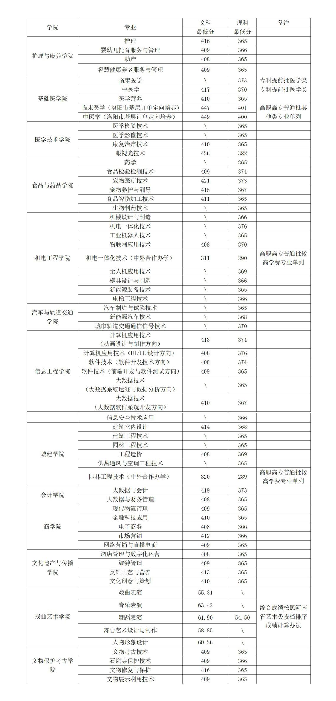 洛阳职业技术学院2023年普招各专业最低录取分数