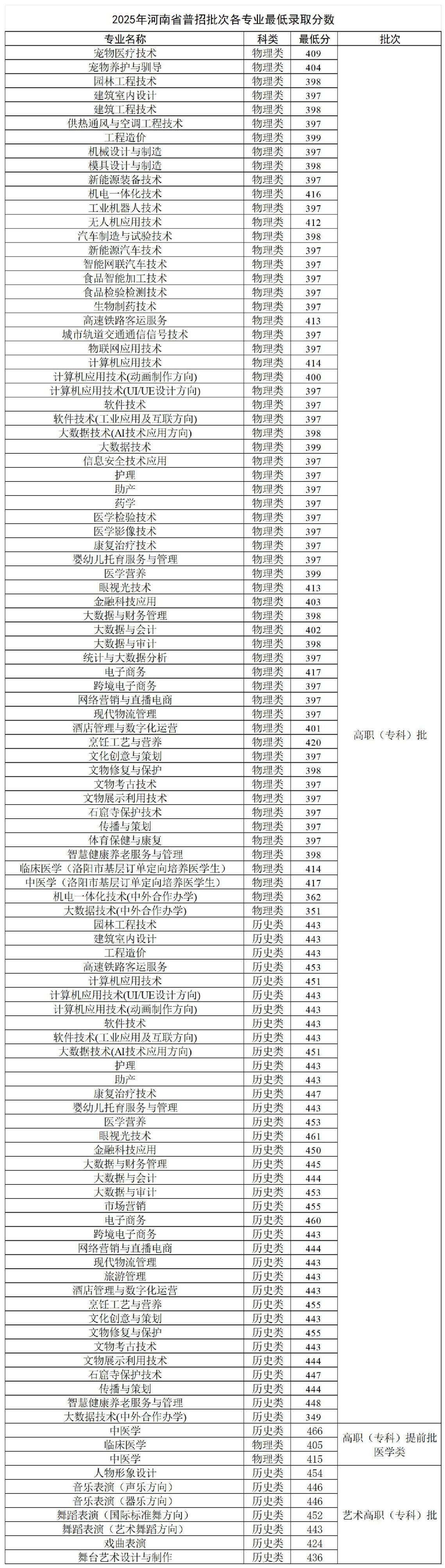 洛阳职业技术学院2025年普招各专业最低录取分数(河南)